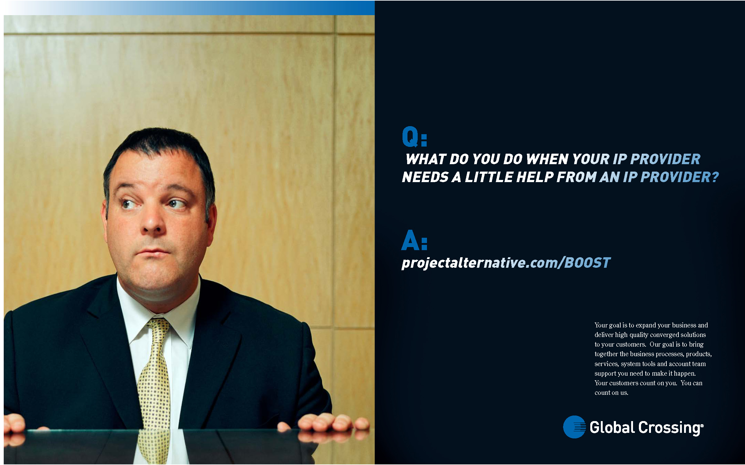 We capitalized on this dissatisfaction by positioning Global Crossing’s unique combination of technology and customer service as the most viable alternative for their global ip needs. We created an ad campaign with a question/answer format that humorously portrayed the frustration customers were facing, and presented GC as the solution.